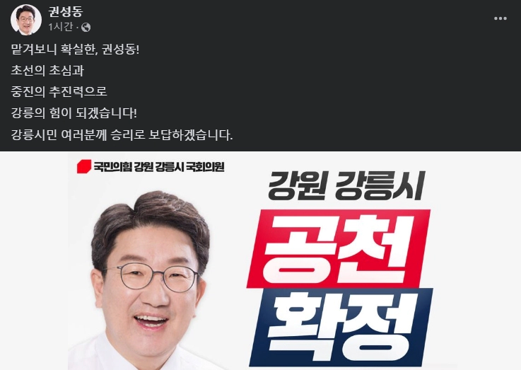 공천 결정 이후, 권 의원은 자신의 페이스북을 통해 강릉시민들에게 승리로 보답하겠다는 다짐과 함께, 초선 시절의 초심과 중진으로서의 추진력을 바탕으로 강릉의 발전을 위해 힘쓰겠다는 의지를 표명했습니다.