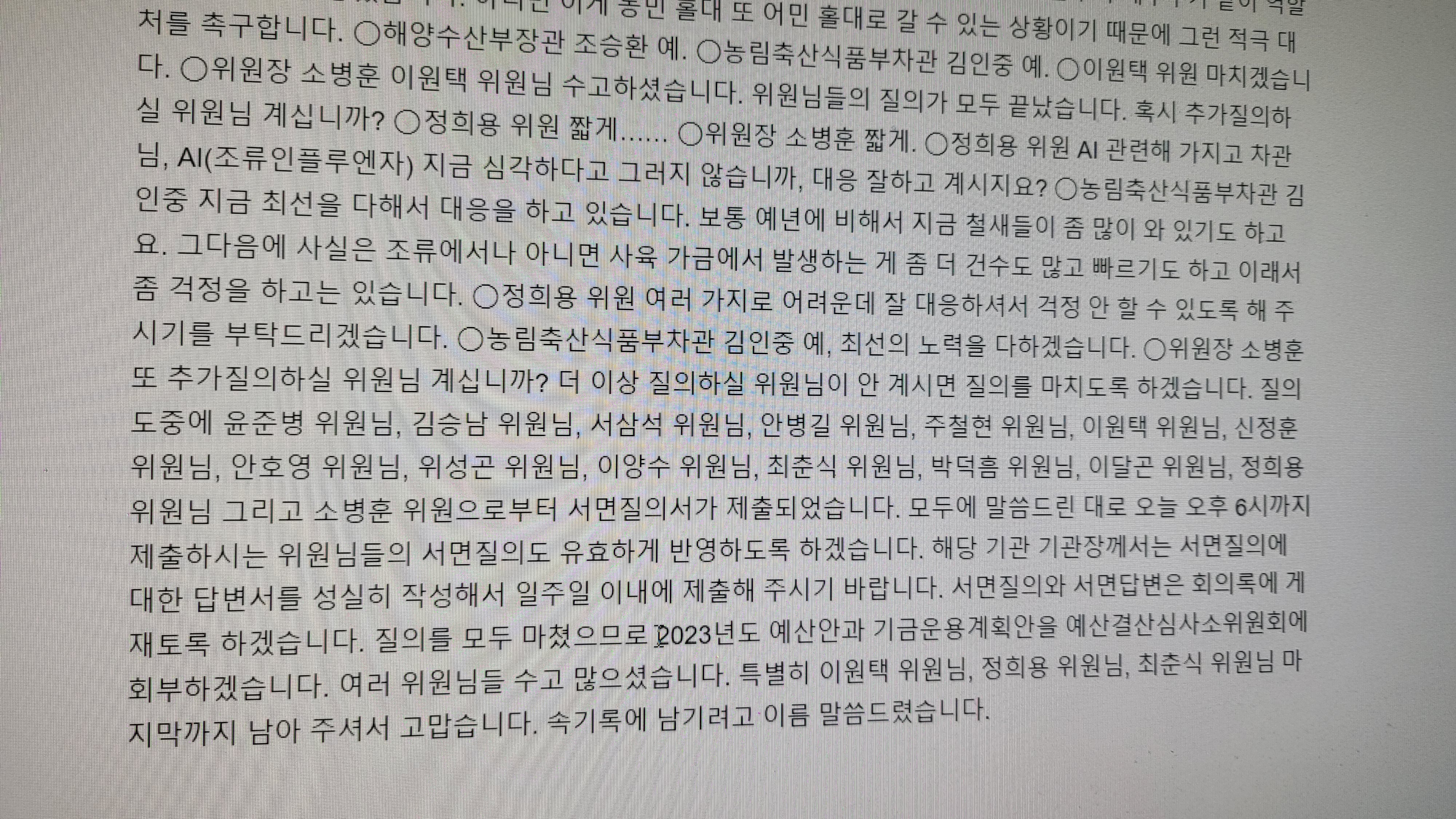 ◯李達坤 위원 위원장님, 의사진행발언 있습니다. ◯위원장 소병훈 나머지 진행한 다음에 하시지요. 회의에 들어가기에 앞서 잠시 안내말씀 드리겠습니다. 정황근 농림축산식품부장관과 조재호 농촌진흥청장으로부터 불출석사유서가 제출되었고, 이에 위원장이 간사 위원님들과 협의하여 불출석을 허가하였다는 말씀을 드립니다. 그리고 오늘 회의는 국회방송을 통해 생중계되고 있음을 알려 드립니다. 그러면 회의에 들어가기 전에 의사진행발언 듣겠습니다. 이달곤 위원님. ◯李達坤 위원 방금 위원장님께서 여러 가지 말씀을 주셨는데, 물론 농식품해양수산위 위원장님으로서 할 수 있는 말씀입니다마는, 그러나 우리가 감사를 하면서도 많이 느꼈습니다마는 농식품․해양 부분에 있어서 기관이 지난 5년 동안 과다하게 팽창된 것을 많이 발견했습니다. 인력도 어떤 기관은 심지어 30% 가까이 는 데가 있습니다. 저희들이 감사하러 가니까요, 솔직히 말해서 감사하는 공간이 비좁았잖아요, 직원들 때문에? 그리고 인건비가 사오십 % 는 기관도 있습니다. 물론 농림이라든지 식품이라든지 축산이라든지 해양은, 수산은 어려운 분야입니다. 그러나 이 분야의 진정한 도움을 위해서는 소위 1차 산업 화이트칼라에 대해서는 상당히 예민하게 봐야 됩니다. 그래서 그 사람들이 과연 생산성 있게 어민과 수산인과 축산인과 농민을 위해서 진짜 일하고 있느냐를 봐야 됩니다. 대표적인 예로 지금 식품 자립도는 계속 떨어지고 있는데 다 농민 탓하고 있습니다. 그 중간에 있는 화이트칼라는 책임지는 자세를 전혀 보이지 않고 있습니다. 그렇기 때문에 새 정부에 있어서는 진정으로 생산에, 유통에 종사하시는 분의 복지를 위해서 중간에 있는 화이트칼라를 효율화하고 생산성을 높이는 과업을 하는 것이지 그 사람들이 싫어서 하는 것은 아닙니다. 자리 보존해야지요, 일자리 중요하지요. 중요한 것은 일자리의 생산성과 창의성이 얼마나 되느냐 하는 것을 따져야 하기 때문에 지금 위원장님께서 말씀하시는 일방적인 이야기는 새 정부에서는 거의 수용할 수 없는 이야기도 상당히 있다 그런 말씀을 드리겠습니다. ◯위원장 소병훈 또 의사발언하실 분 안 계시면…… 윤준병 위원님. ◯윤준병 위원 지난주까지 위원님들 국정감사하시느라 고생하셨고 우리 수감기관들도 수고를 많이 했습니다. 국정감사 과정에서 쟁점이 됐던 내용 중의 하나가 서해 피격 공무원과 관련된 내용이 쟁점이 되었습니다. 관련해서 진실을 확인하기 위한 노력들을 위원님들께서 많이 해 주셨는데, 특히 해경에서는 그동안 3차 발표됐던 내용과 배치되는 듯한 그런 발표를 금년 6월 16일 날 했습니다. 특히 그중에 ‘월북 의도를 인정할 만한 증거를 발견하지 못했다’ 이와 같은 내용을 발표해서 국민들께서 꽤 혼란스럽기도 하고 거기에 큰 증거자료가 있는 듯한, 그래서 예전에 세 번에 걸친 발표가 잘못된 것처럼 느껴지는 그런 발표를 했습니다. 그래서 위원들께서 여기에 관련된 내용의 실체가 뭔지 이 부분을 확인하기 위한 노력을 꽤 했는데 여전히 해경 또 해경청장, 해경의 수사국장 이분들이 답변한 내용들은 ‘월북 혐의에 대해서 수사를 했는데 필요한 소송법상 증거를 확보하지 못했다’. 또 ‘수사상 필요한 SI를 요청했는데 국방부가 제공하지 않았다’ 이런 내용이었습니다. 그런데 저희가 문서 검증까지 해 보니까 실제 국방부에 자료 요청한 내용에 대해서는, SI 정보를 요청했는데 ‘두 번에 걸쳐서 이미 상세하게 제공했기 때문에 추가적으로 정보를 제공할 내용이 없다’ 이런 내용도…… ◯위원장 소병훈 윤준병 위원님, 질의시간에 하시면 어떻겠습니까? ◯윤준병 위원 아니, 지금 요청하려고 그럽니다, 상황 설명하고요.