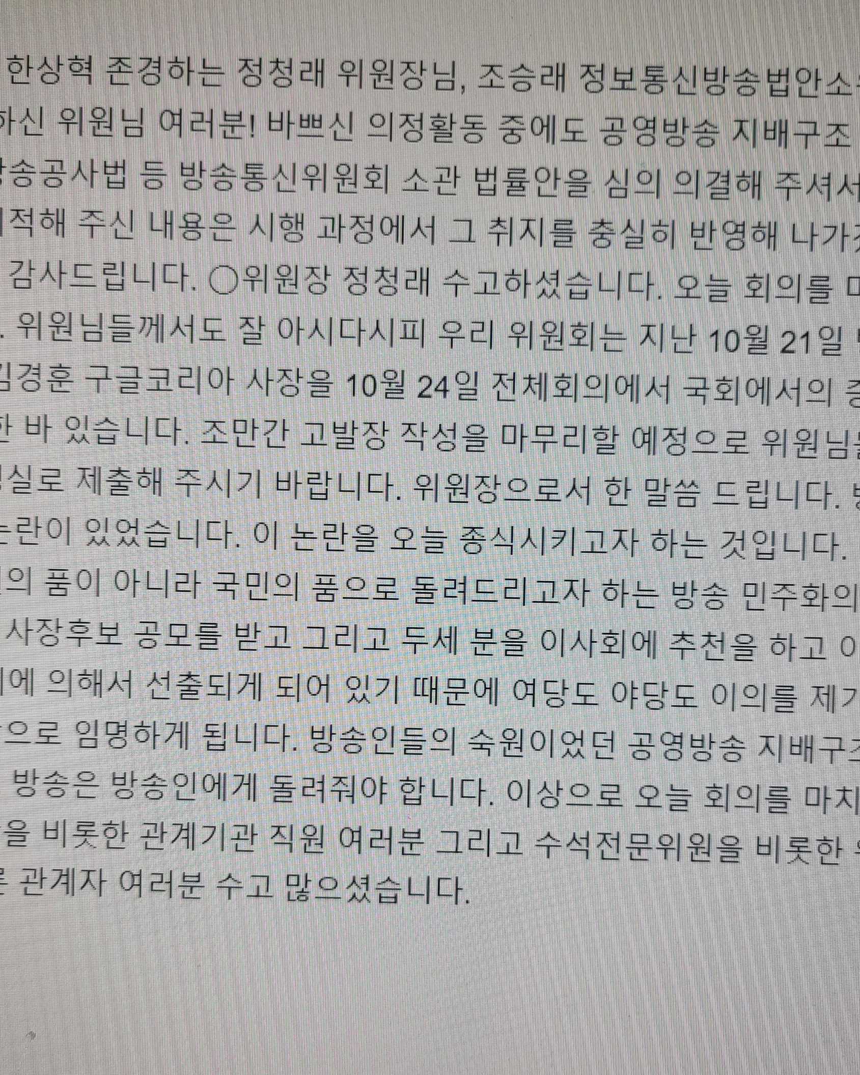 ◯방송통신위원장 한상혁 존경하는 정청래 위원장님, 조승래 정보통신방송법안소위 위원장님과 위원님 그리고 이 자리에 참석하신 위원님 여러분! 바쁘신 의정활동 중에도 공영방송 지배구조 관련 방송법, 방송문화진흥회법, 한국교육방송공사법 등 방송통신위원회 소관 법률안을 심의 의결해 주셔서 감사드립니다. 법안을 심의하는 과정에서 지적해 주신 내용은 시행 과정에서 그 취지를 충실히 반영해 나가겠습니다. 다시 한번 국회의원님들의 노고에 감사드립니다. ◯위원장 정청래 수고하셨습니다. 오늘 회의를 마치기 전에 한 가지 안내말씀 드리겠습니다. 위원님들께서도 잘 아시다시피 우리 위원회는 지난 10월 21일 방통위에 대한 국정감사에서의 위증 혐의로 김경훈 구글코리아 사장을 10월 24일 전체회의에서 국회에서의 증언․감정 등에 관한 법률에 따라 고발 의결한 바 있습니다. 조만간 고발장 작성을 마무리할 예정으로 위원님들께서 추가로 제출할 자료가 있으시면 행정실로 제출해 주시기 바랍니다. 위원장으로서 한 말씀 드립니다. 방송법 개정안은, 수십 년간 방송을 둘러싼 논란이 있었습니다. 이 논란을 오늘 종식시키고자 하는 것입니다. 방송은 방송인에게 돌려드리고 방송을 정권의 품이 아니라 국민의 품으로 돌려드리고자 하는 방송 민주화의 일환입니다. 사장후보 국민추천제를 통해서 사장후보 공모를 받고 그리고 두세 분을 이사회에 추천을 하고 이사회에서 21명의 이사의 3분의 2 특별다수제에 의해서 선출되게 되어 있기 때문에 여당도 야당도 이의를 제기할 수 없는 중립적이고 공정한 인사를 사장으로 임명하게 됩니다. 방송인들의 숙원이었던 공영방송 지배구조 개선이 하루빨리 이루어지기를 바랍니다. 방송은 방송인에게 돌려줘야 합니다. 이상으로 오늘 회의를 마치겠습니다. 존경하는 여러 위원님, 방통위원장을 비롯한 관계기관 직원 여러분 그리고 수석전문위원을 비롯한 위원회 공무원, 보좌직원 등 국회 직원과 언론 관계자 여러분 수고 많으셨습니다.
