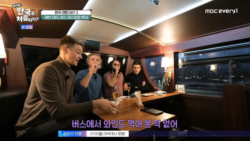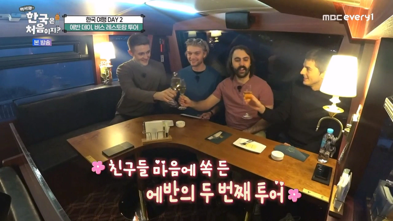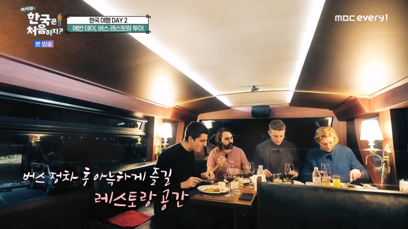 호스트 에반은 캐나다에서 온 친구들과 함께 버스 레스토랑을 체험했습니다. 서울 도심 구경은 물론, 코스 요리와 멋진 공연이 준비된 색다른 버스 투어에 친구들은 큰 감동을 받았습니다. 또한 버스 제일 앞자리에서 즐길 수 있는 탁 트인 시야와 레스토랑 공간까지 갖춘 내부를 보고 감탄하며 식사 뿐만이 아니라 버스 내에서 마술쇼 공연까지 감상하는 모습이 방영되었습니다.