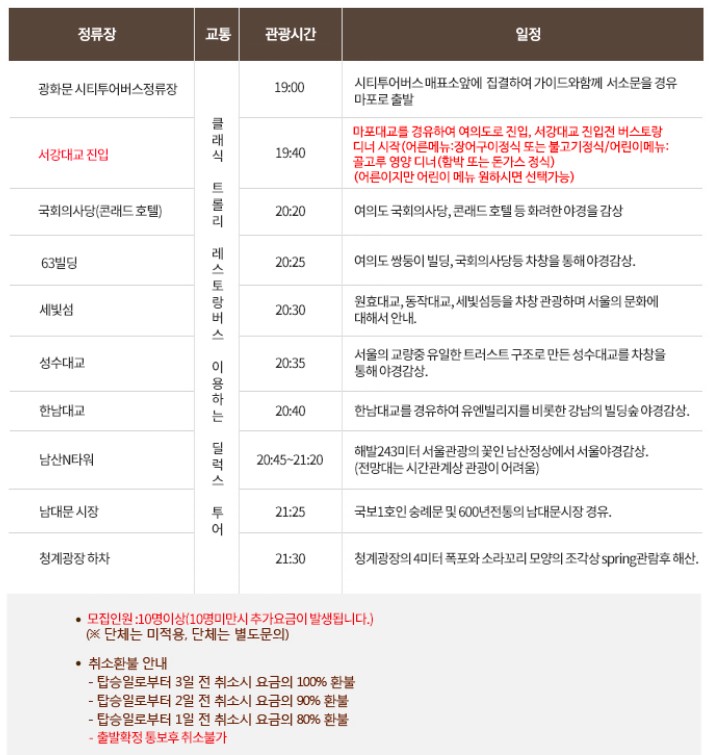 서울에서 버스 레스토랑 투어 상품을 운영하고 있는 곳은 서울시티투어라는 회사입니다. 버스 레스토랑 투어 상품은 낮에 하는 데이팩과 밤에 진행하는 나이트팩이 있습니다. 버스 레스토랑 가격은 데이팩은 어른은 45,000원 어린이는 40,000원입니다. 나이트팩은 어른 36,000, 어린이는 31,000입니다. 데이팩과 나이트팩 일정 및 상세 코스는 아래 홈페이지를 통해서 확인하실 수 있습니다.