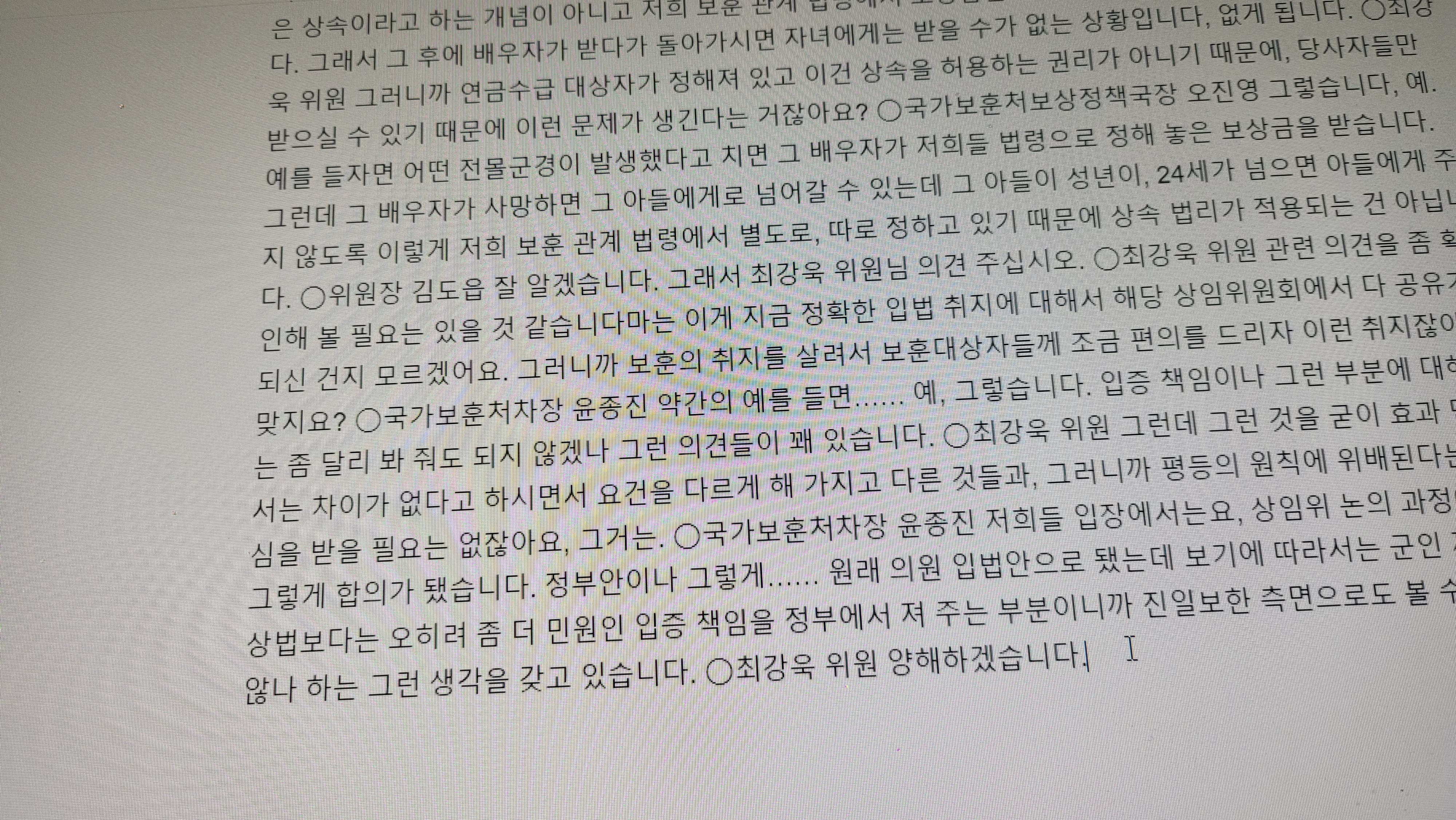 ◯국가보훈처차장 윤종진 예. ◯최강욱 위원 왜 이렇게 하게 됐지요? ◯국가보훈처차장 윤종진 정무위에서 논의를 할 때요, 특히 야당 위원님들께서 국가유공자분들은 일반 분야하고 좀 다른 특수한 이런 부분이 있는데 상속인에게 너무 과도한 입증책임이나 아니면 재산상 부담을 가중시키는 것은 바람직하지 않다, 그런 의견들이 많았습니다. 그래서 단서에도 상속인의 경우에는 상속받은 재산의 한도 내에서 납부한다든가 이런 부분들이 추가가 된 부분들이 있습니다. 그래서 상속인의 부담을 조금 더 완화할 필요가 있다는 취지가 담겨 있다는 말씀을 드리고요. 저희 정부 입장에서도 이미 보훈급여금이라든가 이런 것들을 환수 통지를 할 때에는 거짓․부정이 있었다든가 귀책사유가 있다고 보고 통지를 합니다. 하기 때문에 일정 부분 현재도 민원인보다는 정부 측에서 상당 부분 입증책임을 부담을 하고 있습니다. 그래서 약간 다른 법률하고, 특히 군인 재해보상법하고 사례로 돼 있는데요. 실제로 약간 표현상의 차이는 있지만 현실에서 법원에나 문제가 되었을 때는 큰 문제가 없을 것으로, 정부 부담이 없을 것으로 그렇게 판단을 하고 있습니다. ◯최강욱 위원 그러니까 이미 귀책사유를 확인한 다음에 통지를 하기 때문에 굳이…… ◯국가보훈처차장 윤종진 예, 왜냐하면 저희들이…… 예를 들면 거짓이나 부정이 있었다고 할 때 이렇게 보면 주로 많이 나오는 내용이 사망신고 지연이라든가 이전에 배우자로 있었는데 개가를 했다든가 범죄사실이 있다든가 이런 것들이 대부분이거든요. 그리고 이런 것들이 대개 사유가 논란이 되는 부분들은 아닙니다. 명확하게 행정청에서 확인 가능한 부분들이 있습니다. 그래서 그런 부분들은 상속인이라든가 민원인 편의 차원에서 이렇게 해 줄 수 있는 부분이 있다고 봅니다. ◯최강욱 위원 보훈 대상자들이기 때문에 지금 일반 연금이나 재해보상하고는 다르게 봐야 되는 것 아니냐…… ◯국가보훈처차장 윤종진 예, 예를 들면 정부에서, 저희들이 상속인이나 국가유공자분들한테 책임을 더 지우면 문제가 되는데 부담을 좀 더 완화해 주는 부분이지 않습니까. 그래서 그런 부분들이 또 크게 차이가 많이 나고, 다른 분야하고 큰 차이가 나고 하면 문제가 되는데 현실적으로는 규정이 좀 다르더라도 그렇게 큰 차이는 없을…… ◯최강욱 위원 이게 지금 사례는 얼마나 돼요, 부정수급액이 확인돼서 환수가 진행되는 게? ◯국가보훈처차장 윤종진 금년도에 발생한 건 한 40건 정도 됩니다. ◯최강욱 위원 주로 어떤 유형이에요? 아까 여러 가지 유형을 말씀하셨는데 제일 많은 게 뭐예요? ◯국가보훈처차장 윤종진 가장 많은 게요…… ◯최강욱 위원 이게 지금 상속인의 입증책임하고 주로 관련이 돼 있는데 아까 말씀하신 것에는 그런 사례가 아닌 것도 포함돼 있어서 여쭤보는 거예요. ◯국가보훈처차장 윤종진 있는데, 가장 많은 게 사실은 사망신고 지연 관련되는 부분하고요. 그다음에 재혼하면 보상의 수급권이 없어지는데 그런 부분들이 많이 있습니다. ◯최강욱 위원 사망신고를 지연시키는 것하고 상속인의 권리하고 무슨 관련이 있지요? 지연시키는 것은 어차피 당사자 이름으로 계속 받게 하려고 그러는 거잖아요, 상속인이? ◯국가보훈처차장 윤종진 예, 받았는데 상속이 발생이 된 거지요. 됐는데, 추후에 확인했다든가 생존, 추후에 확인되는 경우도 있고…… 저희들이 법을 집행하는 데는 크게 문제가 없다는 말씀을 드립니다. ◯최강욱 위원 그러니까 상속인이 사망신고를 늦춰 가지고 그래서 그 늦춘 것 자체가 상속인의 귀책사유에 해당한다, 지금 그런 말씀을 하시는 거지요? ◯국가보훈처차장 윤종진 예, 그렇습니다. ◯최강욱 위원 그러면 그렇게 되면 뭐가, 연금액이 많아져요? ◯국가보훈처차장 윤종진 예? ◯최강욱 위원 상속 신고를 늦추게 되면 연금액이 많아지기 때문에 하는 일이냐고, 그게? ◯국가보훈처차장 윤종진 상속을 늦추는 게 아니라요, 사망신고를 늦춰 가지고 예를 들면 사망을…… ◯최강욱 위원 그러니까 상속인 지위를 얻지 않고 그냥 살아 계신 것처럼 하는 거잖아요, 사망신고를 늦춘다는 게? ◯국가보훈처차장 윤종진 예, 살아 계시…… ◯최강욱 위원 아니, 그렇잖아요. ◯국가보훈처차장 윤종진 예, 맞습니다. ◯최강욱 위원 그러니까 그렇게 됐을 때 액수가 다르냐고요? ◯국가보훈처차장 윤종진 보상금을 더 받기 위해서 그렇게…… ◯최강욱 위원 예? ◯국가보훈처차장 윤종진 보상금을, 예를 들어서 사망신고…… ◯최강욱 위원 그러니까 얼마나 차이가 나요, 그게? ◯국가보훈처차장 윤종진 예를 들면 한 달에 300만 원 받으면…… ◯최강욱 위원 아니, 그러니까 %로 상속인한테는 2분의 1을 지급한다 이런 게 있을 것 아닙니까? ◯국가보훈처차장 윤종진 본인이 살아 있는 걸로 하니까 원금 자체를 다 받는 거지요. 부모 예를 들면…… ◯유상범 위원 상속인이 얼마냐 감해지냐고요? (발언시간 초과로 마이크 중단) (마이크 중단 이후 계속 발언한 부분) ◯최강욱 위원 얼마나 줄어드냐를 여쭤보는 건데…… ◯국가보훈처