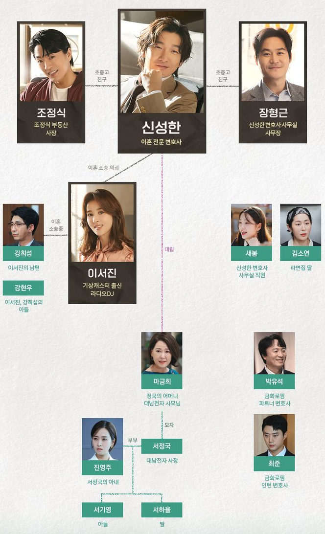 여주인공 이서진은 기상캐스터 출신 라디오 DJ로 양육권 다툼으로 번진 이혼 소송 중, 이혼 전문 변호사 신성한과 엮이기 시작하는 인물입니다.
