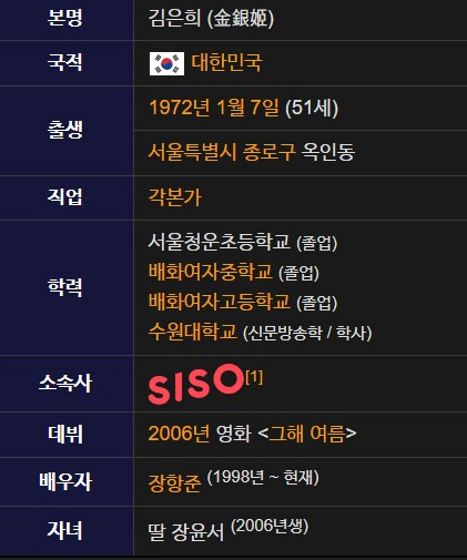 ■ 김은희의 딸, 장윤서는 중학생이 되자 청소년문학상 최연소 금상 수상자가 되었다. 장항준과 김은희 부부와 가까운 배우 장현성은 김은희의 딸을 극찬했다.