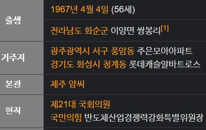 양향자 국회의원은 1967년 4월 4일 전남 화순군 출신으로 올해 57세입니다. 본관은 제주 양씨이며 현재 지역구는 광주 서구을 입니다. 학력은 광주여자상업고등학교, 한국디지털대학교, 성균관대학원 석사과정을 마쳤습니다.