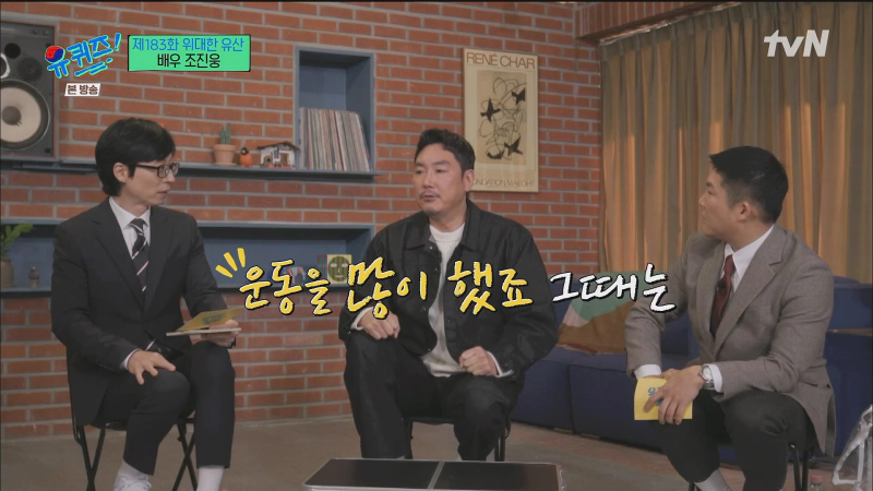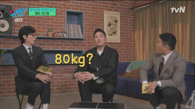 유퀴즈에 참여한 조진웅 배우는 무려 40kg을 감량했던 경험담을 공개했습니다. 2011년 방송된 SBS 드라마 ‘뿌리 깊은 나무’에서 세종의 호위무사 무휼 역을 맡았을적에 늘씬한 자태를 뽐내 사람들의 시선을 사로잡은적이 있어 이를 두고 조진웅은 “120kg에서 80kg으로 감량했다”며 무려 40kg을 감량했다고 설명했습니다.