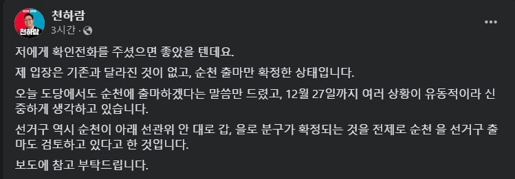 그러나 천 위원장은 자신의 페이스북을 통해 일부 보도에 대해 부인하고 나섰습니다. 그는 순천 출마 의지만 확정한 상태이며, 다른 사항은 여전히 유동적이라고 설명했습니다.