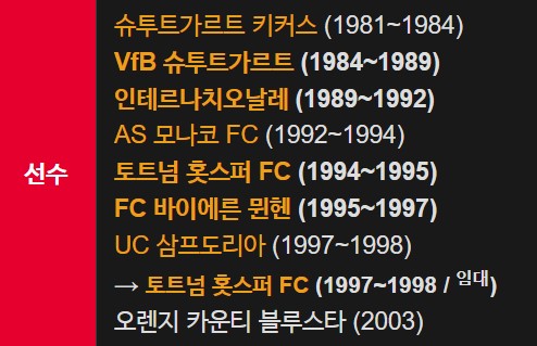 클린스만 프로무대는 슈투트가르트, 바이에른 뮌헨(이상 독일), 인터 밀란(이탈리아), 토트넘(잉글랜드) 등의 유명 클럽에 몸 담았으며 2003년 선수 생활을 마쳤습니다.